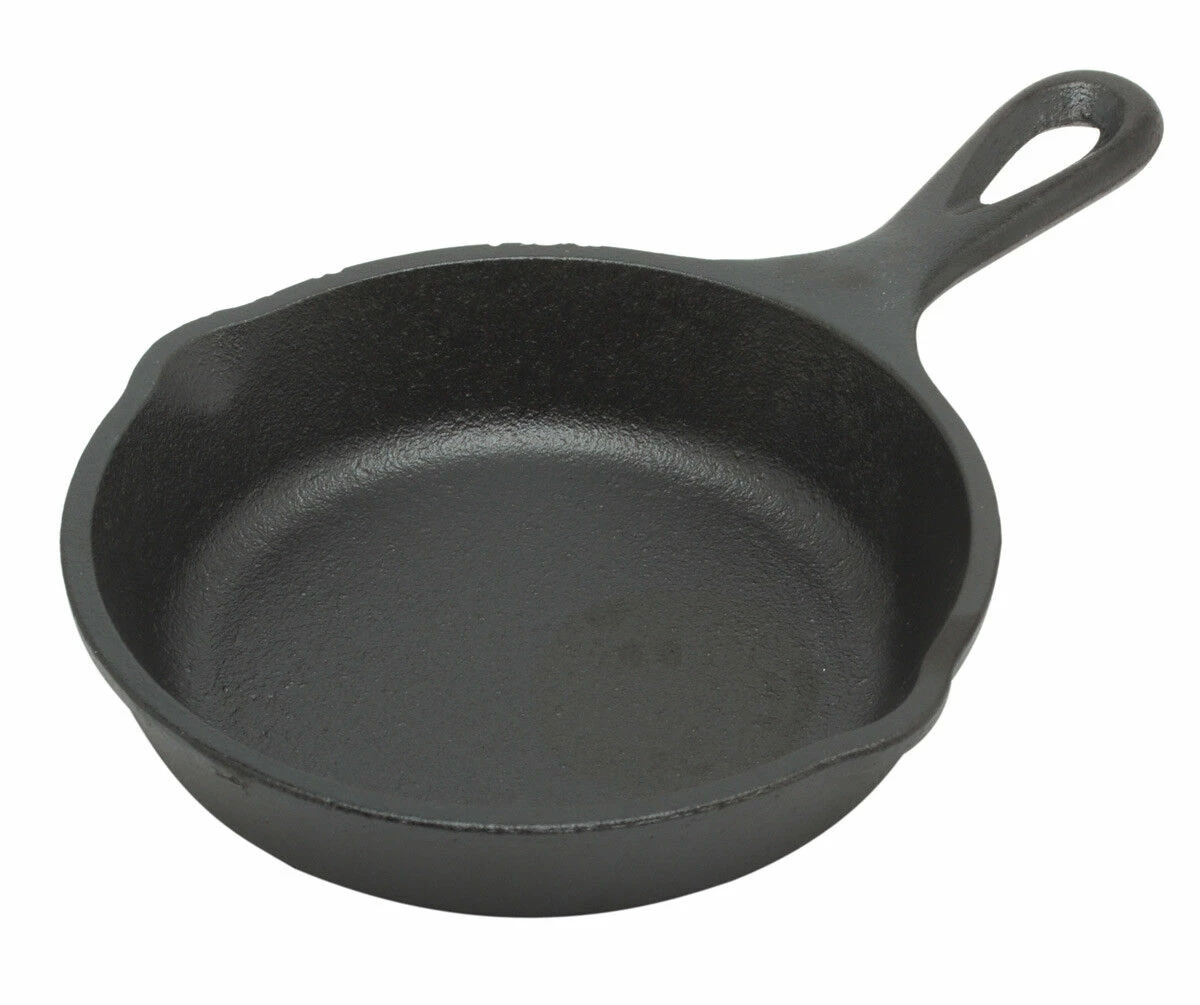 De Lodge Logic mini-skillet koekenpan heeft een diameter van 12,5 cm. De pan en handvat zijn in één keer gegoten van ongeëmailleerd gietijzer. De pan heeft twee schenktuiten die het schenken van ingrediënten uit de pan vergemakkelijken. Gebruik de skillet koekenpan voor het bakken van hamburgers, groenten of aardappelen.