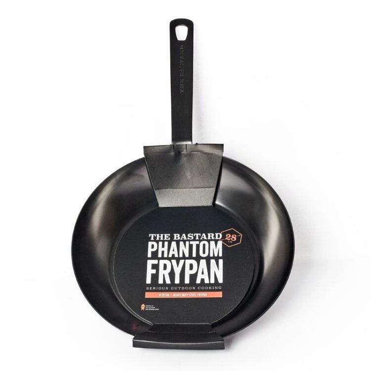 De The Bastard Phantom koekenpan heeft een diameter van 28 cm en is gemaakt van carbonstaal. Het oppervlak van de pan is genitreerd, het is sterk, roestvrij en gaat jaren mee. De Phantom pan is geschikt voor op hoog en direct vuur en heeft een anti-aanbakwerking. Gebruik de koekenpan voor het bakken van diverse ingrediënten op de barbecue.